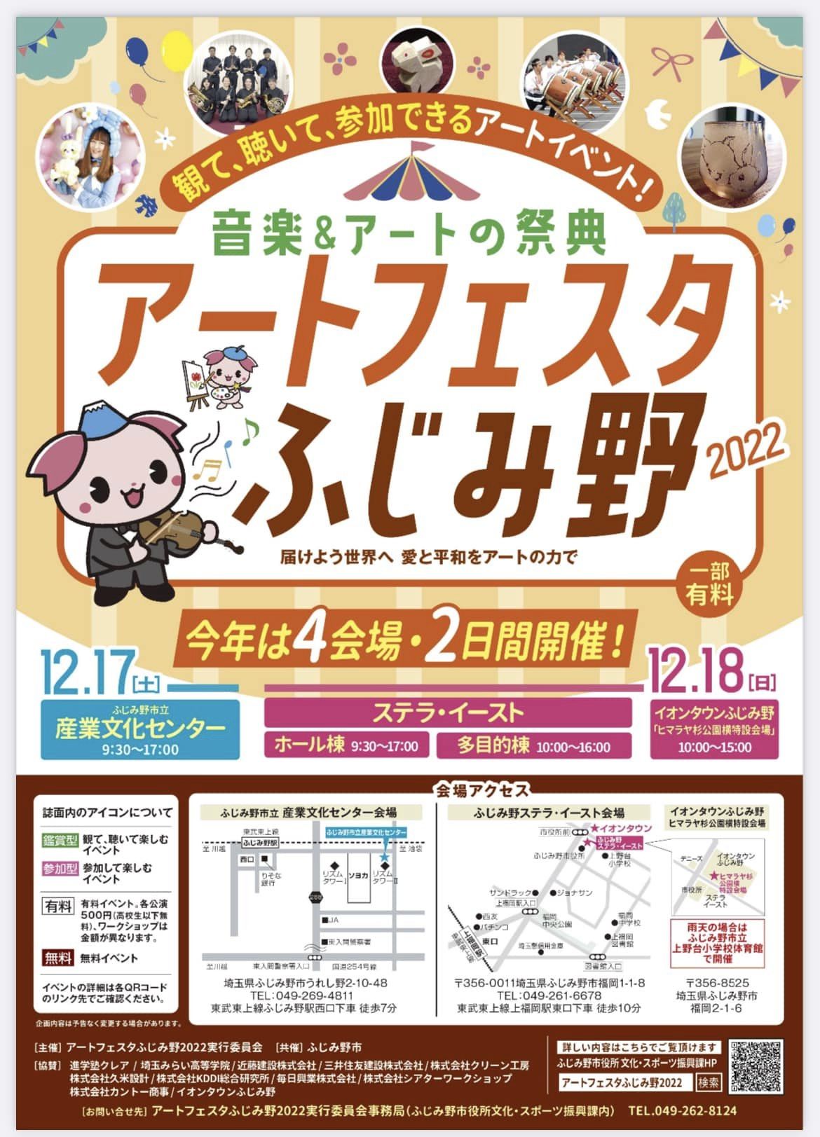 アートフェスタふじみ野2022 出演イベント 2022.12.182024.03.14 今年最後のイベントです。 ヨージックは18日(日)こちらで演奏します。 ●イオンタウンふじみ野ヒマラヤ杉特設ステージ 14:00〜14:30 ●ステラ・イースト多目的棟 15:00〜15:30